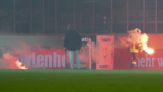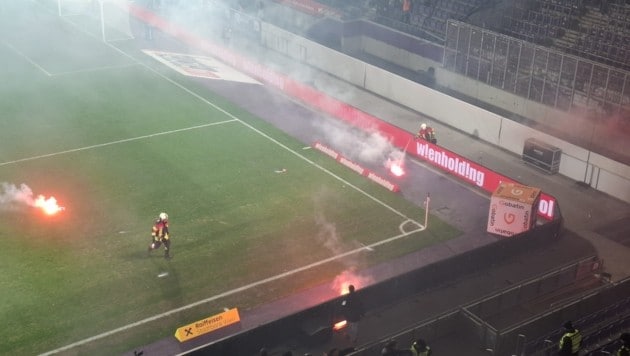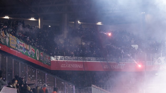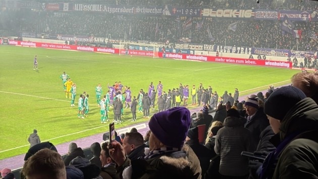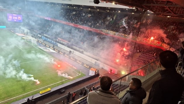 Der Ordnung halber: Dezent gezündelt wurde auch im Austria-Fan-Sektor – wenn auch vermutlich aus anderen Intentionen heraus und auf anderem Niveau. Wohl ging es den Veilchen-Supportern darum, ihrer Freude in Form eines Jubel-Feuerwerks zu verleiehen, die Objekte wurden in die Höhe, nicht bewusst auf den Rasen gefeuert. Gleichzeitig ist auf diversen Video-Schnipseln auch zu sehen, wie sich die vor dem Fan-Sektor jubelnden Spieler teils wegdrehten, um sich vom niederprasselnden „Feuerwerksregen“ zu schützen.